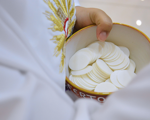 La première communion, c’est recevoir pour la première fois le corps du Christ sous forme d’hostie consacrée par le prêtre.